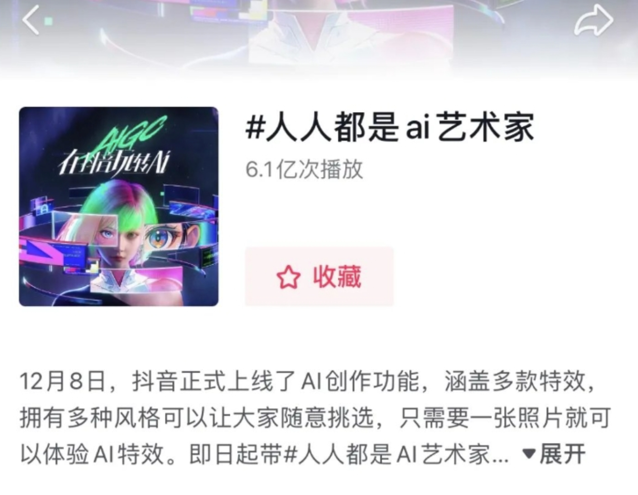 在12月8日,抖音正式推出了Al创作功能,该功能包含了多款特效。其中,话题“人人都是ai艺术家”迅速积累了6.1亿次播放量,引起了广泛的关注。特别是博主“若若跑的贼快”使用的AI漫画特效备受瞩目。与此同时,古风形象生成也成为了热门榜上的焦点。